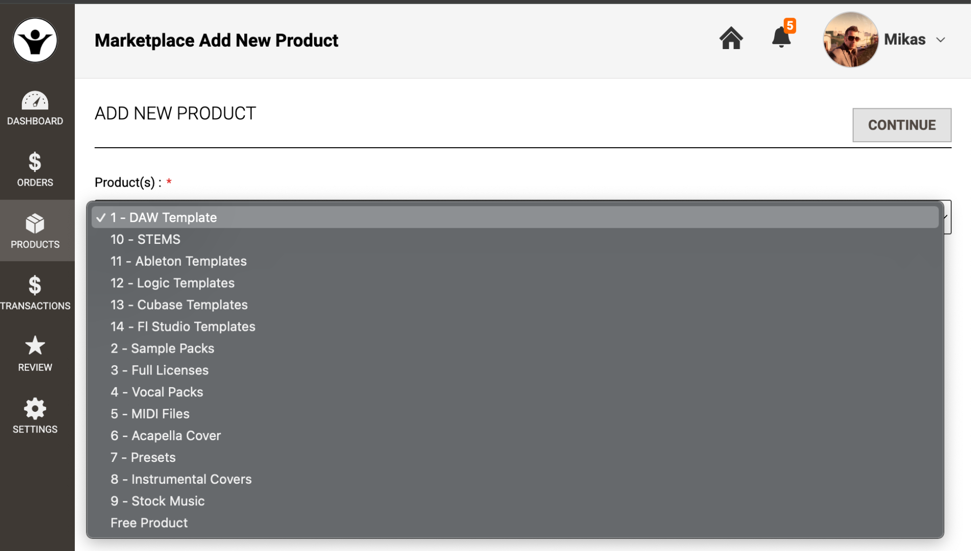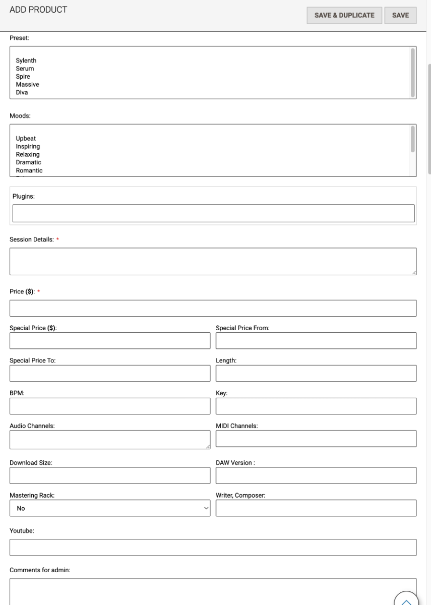 - Sample Pack, Full Licences, Vocal Packs, MIDI Files, Acapella Cover, Presets, Instrumental Covers, Stock Music, Free Product: Select as per the main format of your product